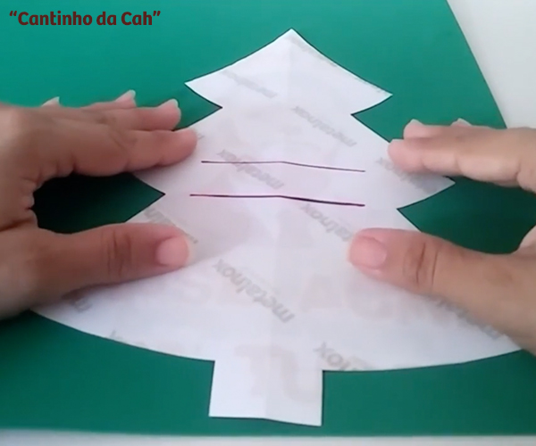 - Con la hoja tamaño carta, traza un pino similar al que ves en la imagen, junto con las dos líneas de en medio. Recorta la figura, junto con las líneas de en medio y traza la misma figura, en el fieltro o foamy.